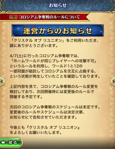 コロシアムのルール改訂が検討されているそうな これなールール見れば誰でも思い付くけど同盟外交したりちゃんと出来てないと成功しないんだよなー 何があったかというと 0470 名無しさん@お腹いっぱい。 2018/04/09 04:16:50>>469 向こうの戦略はコロシア…