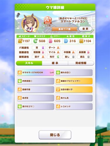 スマートファルコンを育成しているがスキルが引けなくて詰んでる URAはこんなステでも勝てる コンセガチャは勝てる気がしないのでたづなは入れていない なのでやる気ダウンとバステのリカバリーは出来ないものと考えて諦める 地固め発動用に緑スキル3つ欲し…