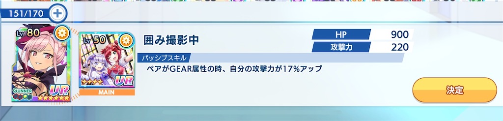 AGは特別潜入班『KIRISHIMA』Lv50:自分がギアの時攻撃力が40%UP。同じギアURの「囲み撮影中」が17%UPなのに属性縛りだけで40%UPっていいんすか、これ。