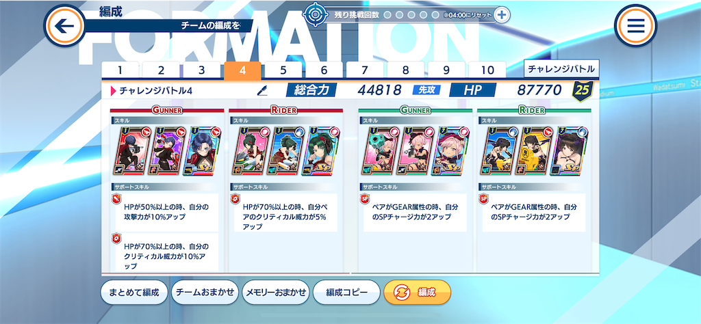 ARはフレームの中の闇と星Lv35:HPが70%時に自分ペアのクリ威力10%UP。1ターン攻撃受けるだけなので条件を満たすのとAGの威力上げに最適なので選択。レベルが低いのは凸できていないからでランキング上位を見るとLV50にしているのでこれ以上順位は無理だなと判断。